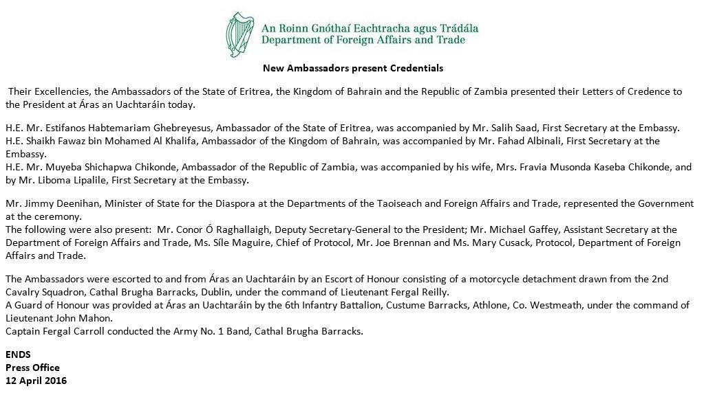 Their Excellencies, the Ambassadors of the State of Eritrea, the Kingdom of Bahrain and the Repulic of Zambia presented their Letters of Credence to the President at Áras an Uachtaráin today.